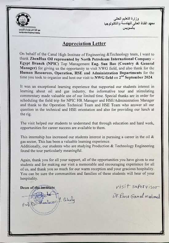 自2014年正式進(jìn)入埃及以來(lái),埃及NPIC公司積極履行社會(huì)責(zé)任,支持埃及當(dāng)?shù)亟逃聵I(yè)發(fā)展,已與多所埃及高校建立了合作關(guān)系,作為實(shí)習(xí)基地每年為當(dāng)?shù)卮髮W(xué)生提供了大量實(shí)習(xí)崗位,并以“1對(duì)1師帶徒”形式重點(diǎn)培養(yǎng)學(xué)生油氣開發(fā)管理和現(xiàn)場(chǎng)實(shí)踐操作能力和經(jīng)驗(yàn)。10年來(lái),已累計(jì)為6所大學(xué)提供了800多個(gè)實(shí)習(xí)機(jī)會(huì)及就業(yè)崗位,獲得當(dāng)?shù)卣块T的高度稱贊,多次收到當(dāng)?shù)馗咝5母兄x信,展示了中資企業(yè)的良好形象,助力項(xiàng)目平穩(wěn)運(yùn)營(yíng)。