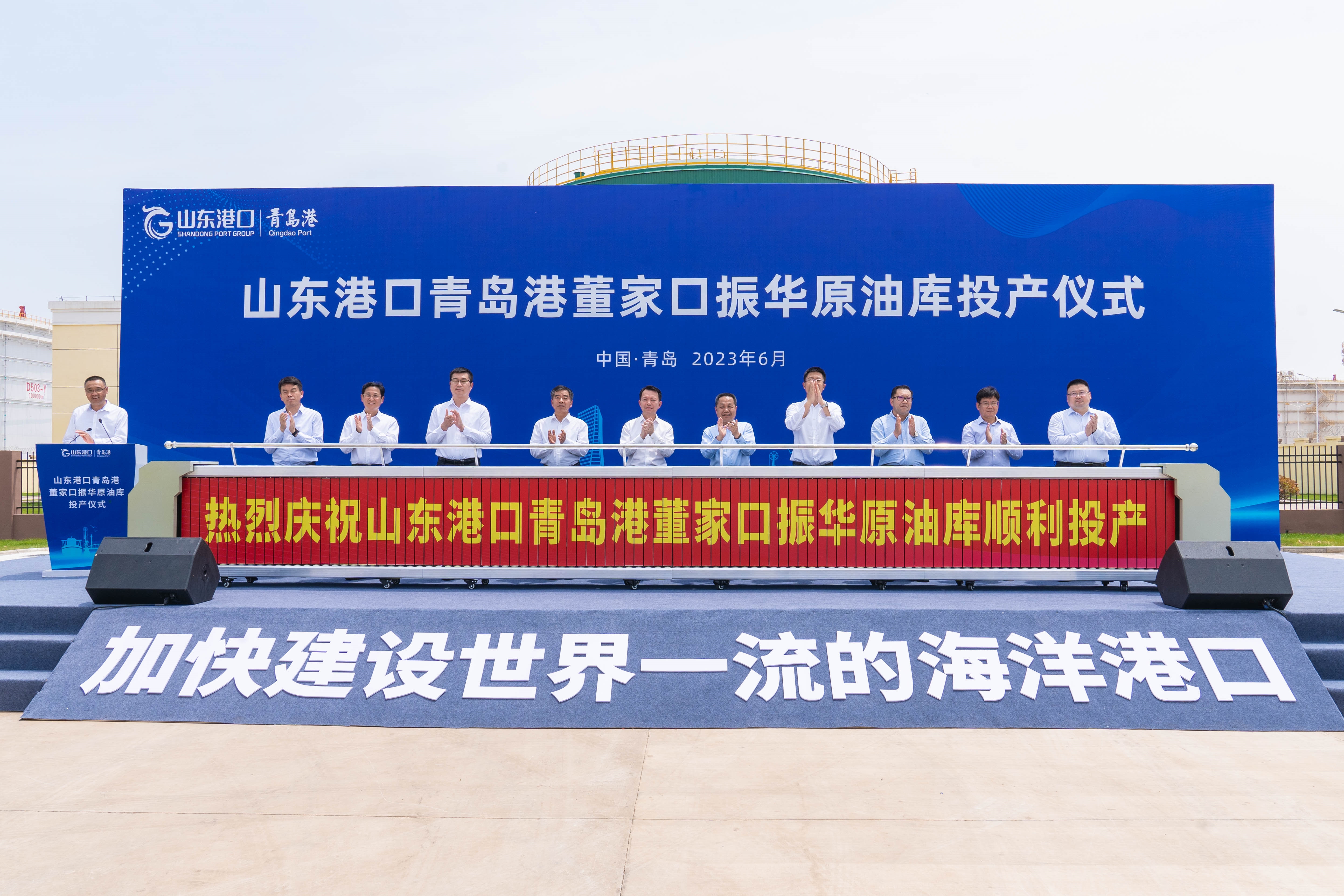 6月2日,振華石油青島董家口原油罐區(qū)項(xiàng)目舉行投產(chǎn)儀式,公司董事長(zhǎng)王粵濤帶隊(duì)出席并致辭。青島市政府相關(guān)部門(mén)、山東港口青島港集團(tuán)、山東有關(guān)煉化企業(yè)及貿(mào)易商、參建單位相關(guān)領(lǐng)導(dǎo)及代表出席。